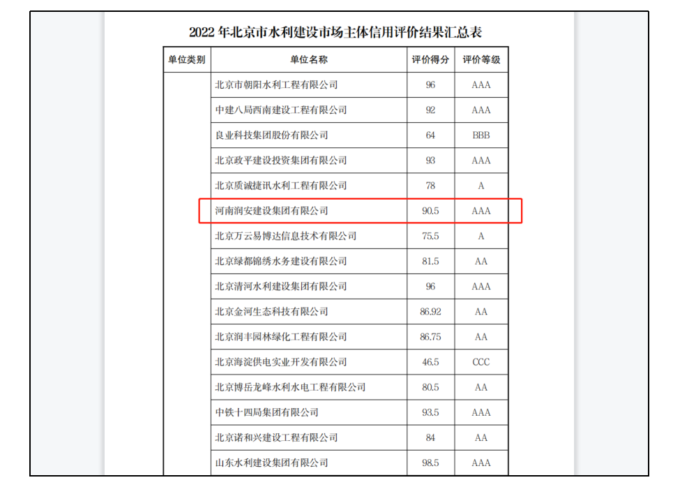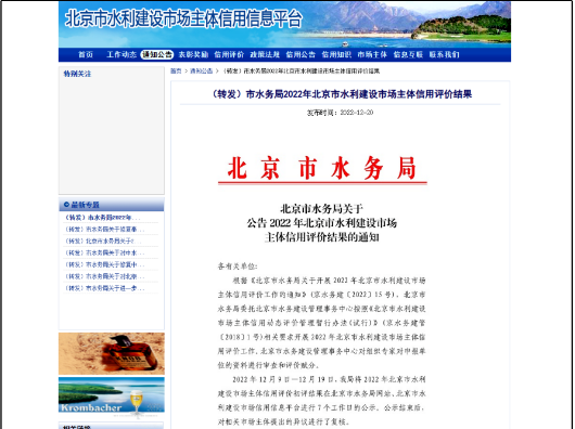 2022年12月22日,北京市水務(wù)局發(fā)布關(guān)于公告2022年北京市水利建設(shè)市場(chǎng)主體信用評(píng)價(jià)結(jié)果的通知,集團(tuán)公司以90.5的高分通過(guò)了此次評(píng)價(jià),獲得了高等級(jí)AAA級(jí)信用評(píng)價(jià),為集團(tuán)公司開(kāi)拓水利業(yè)務(wù)打下了良好的基礎(chǔ)。